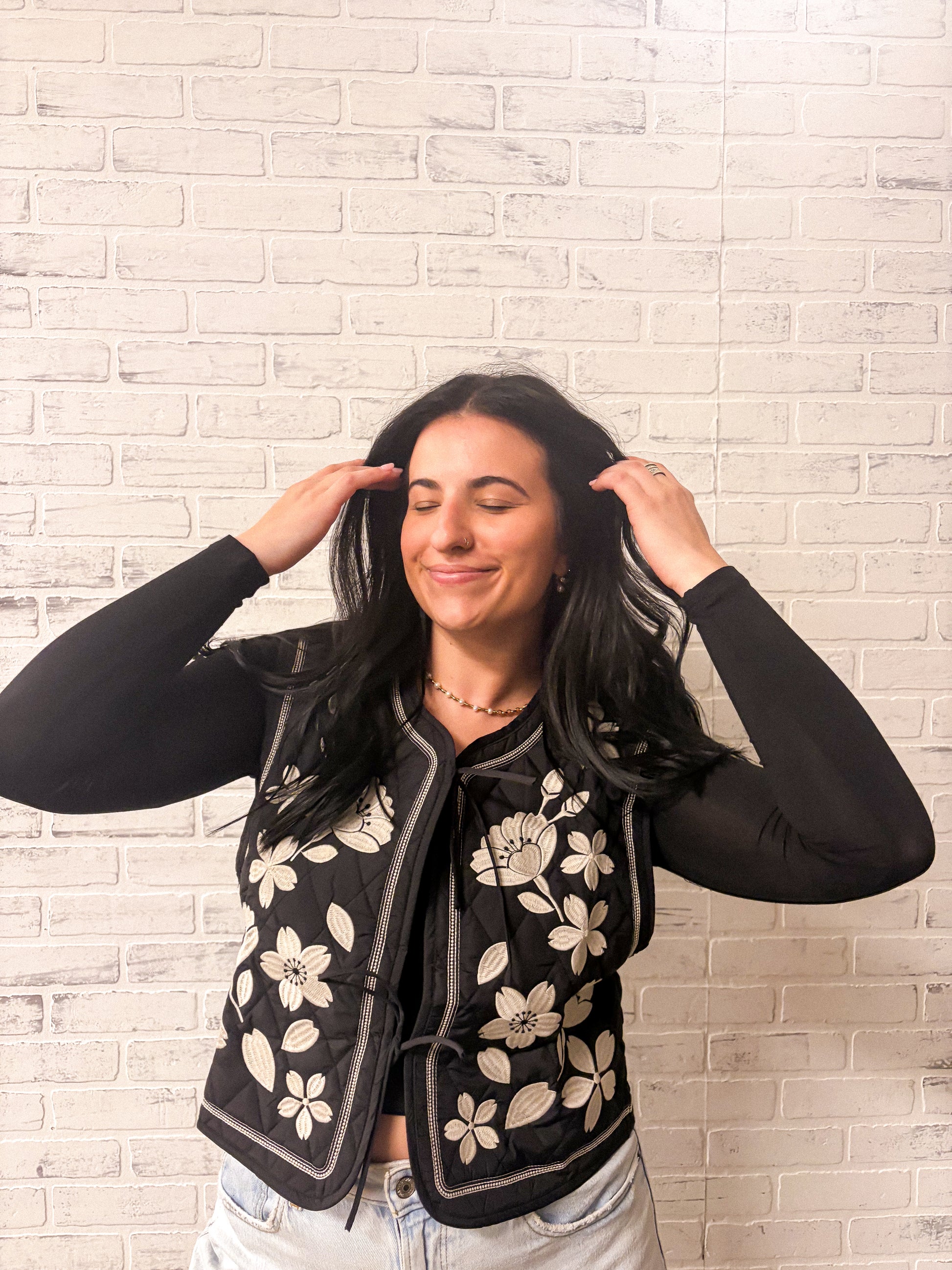 Stay cozy and trendy with our Floral Embroidery Vest. This layerable piece pairs perfectly with jeans or leggings, and features a unique tie-front design. Embrace your inner fashionista!