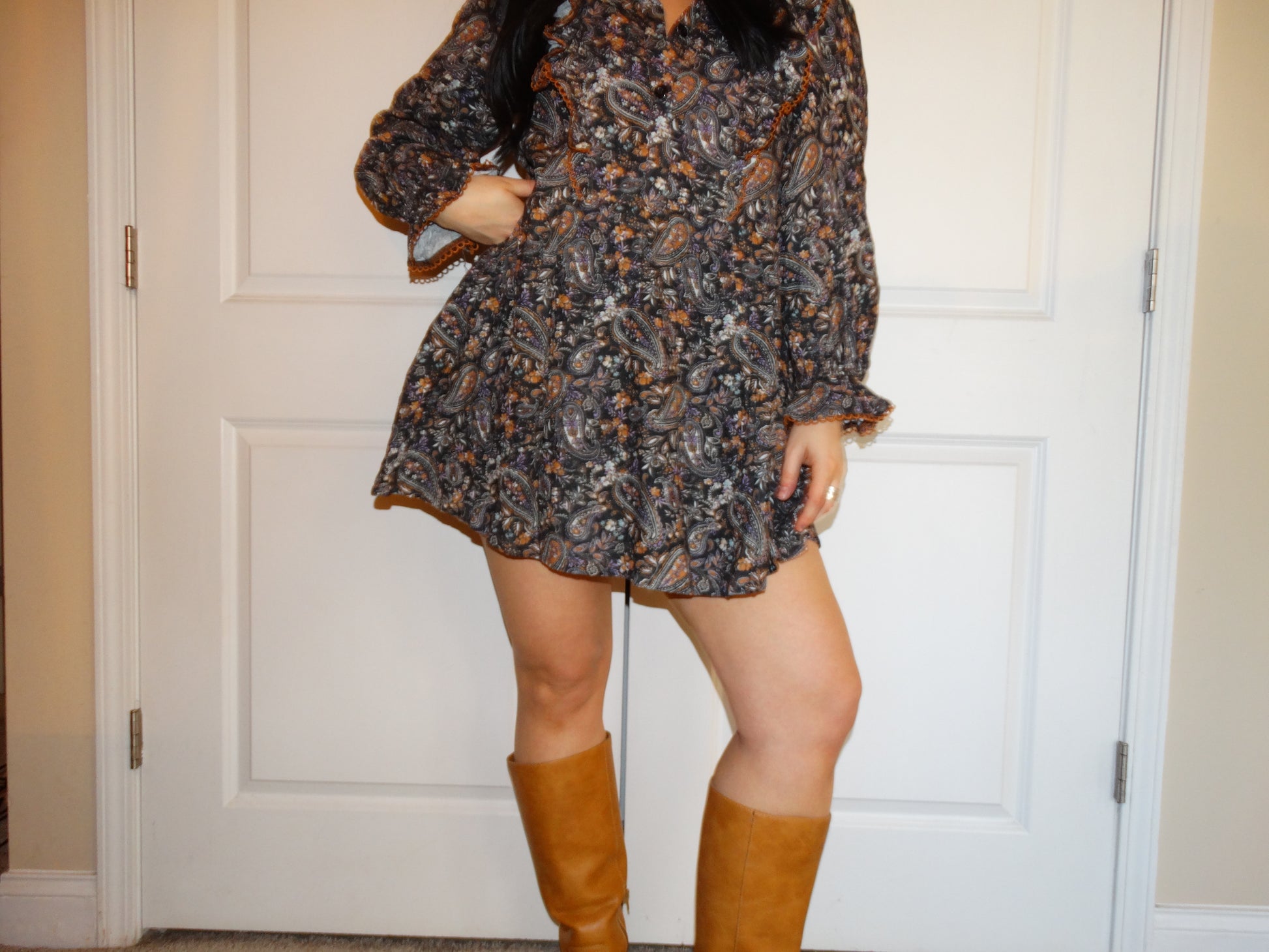 Strut your stuff in this Paisley Print Mini Dress—a delightful mix of western flair and funky colors! With pockets (yes, real pockets!), you can stash your snacks while looking fabulous in black, orange, purple, and white paisley. Perfect for twirling or just pretending you're in a country music video!